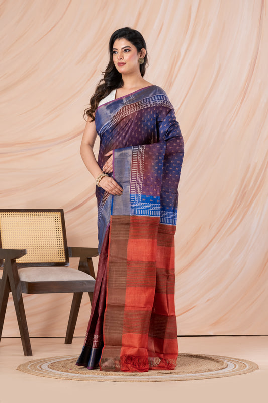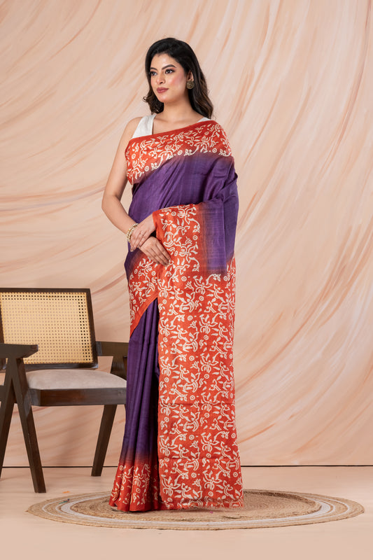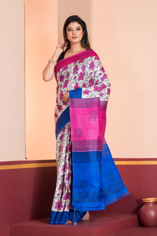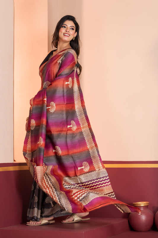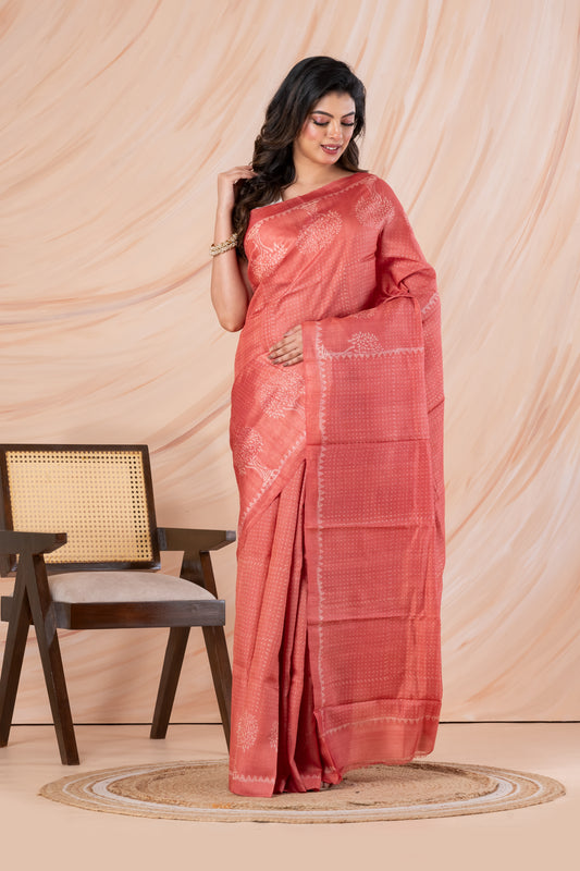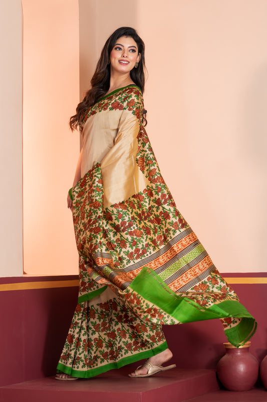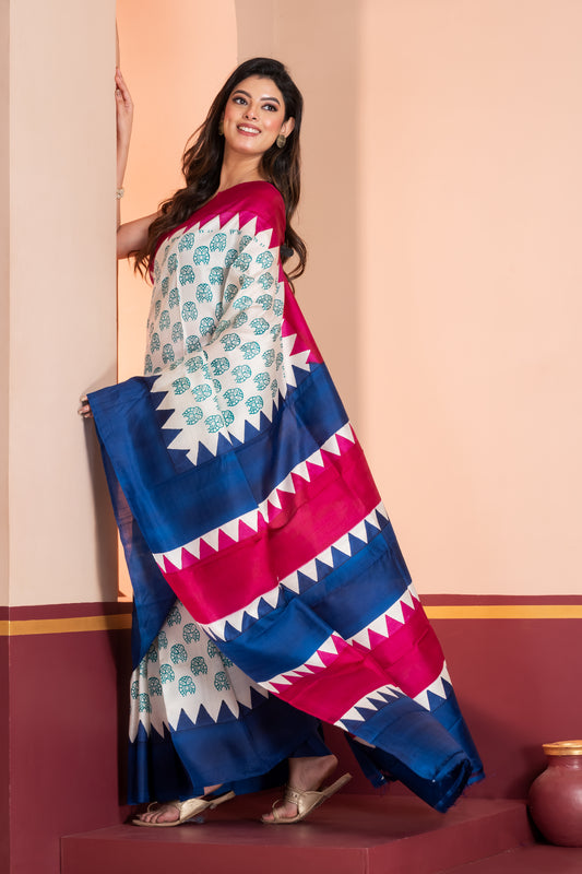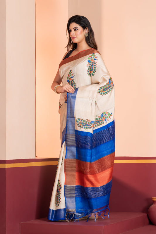 Pure Zari Tussar Printed Saree - Ganga Jamuna Border