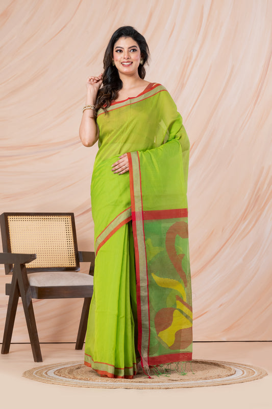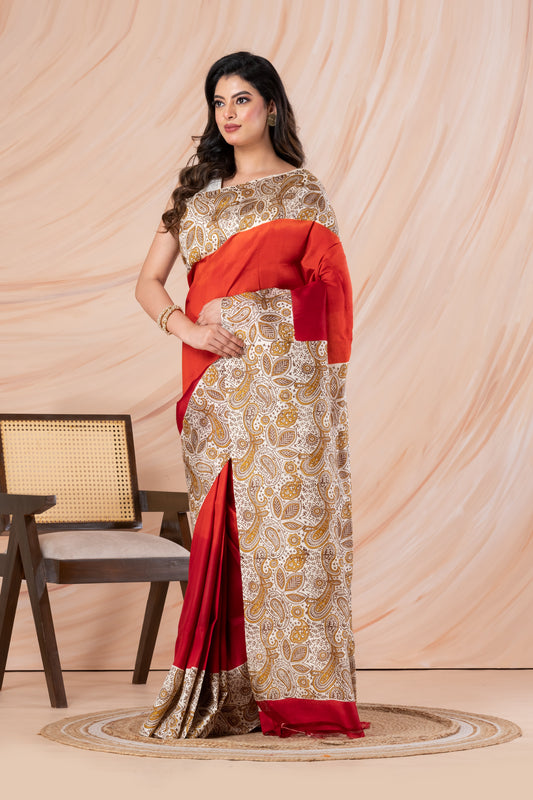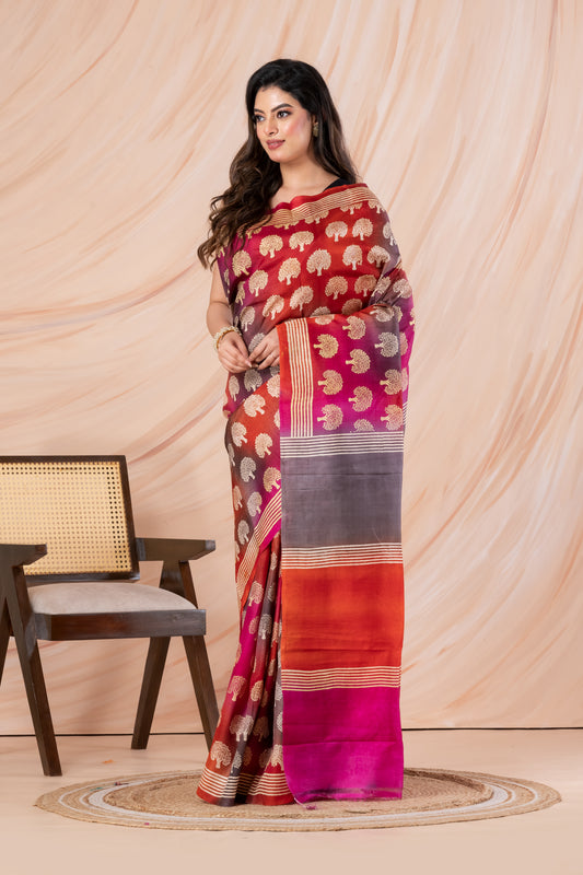 Radiant Red-Orange Ombre Pure 3-Ply Silk Saree
