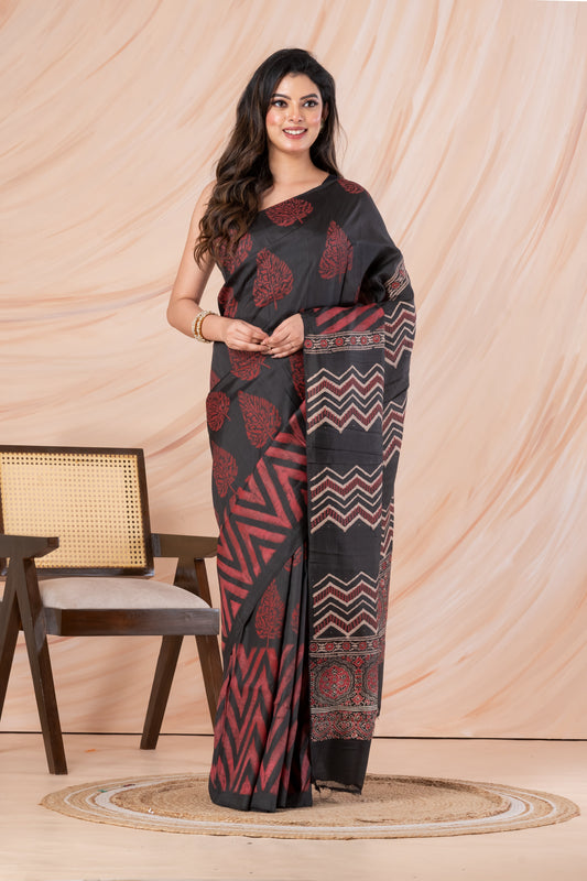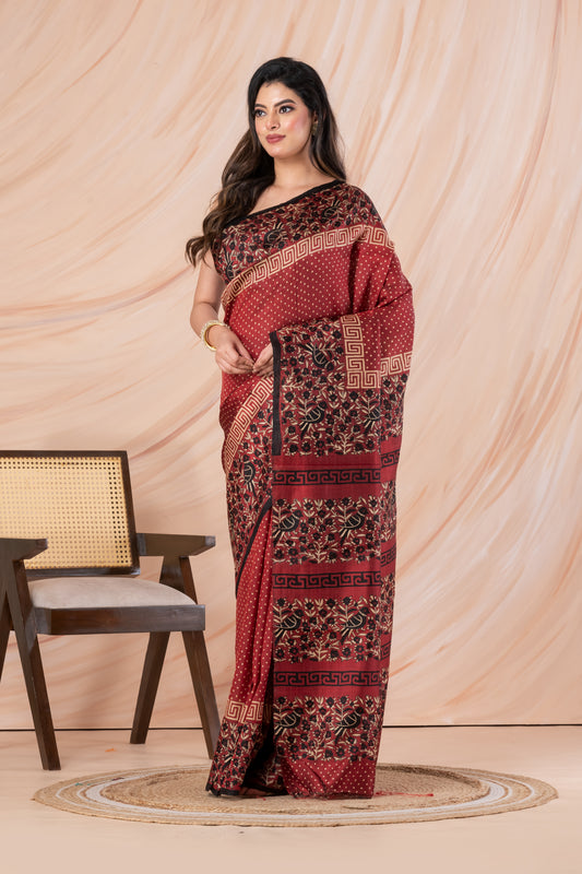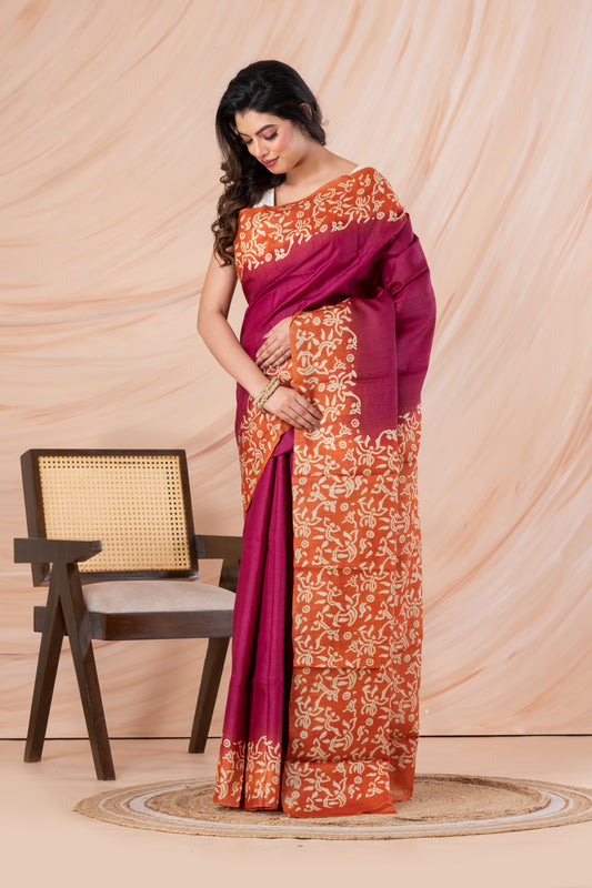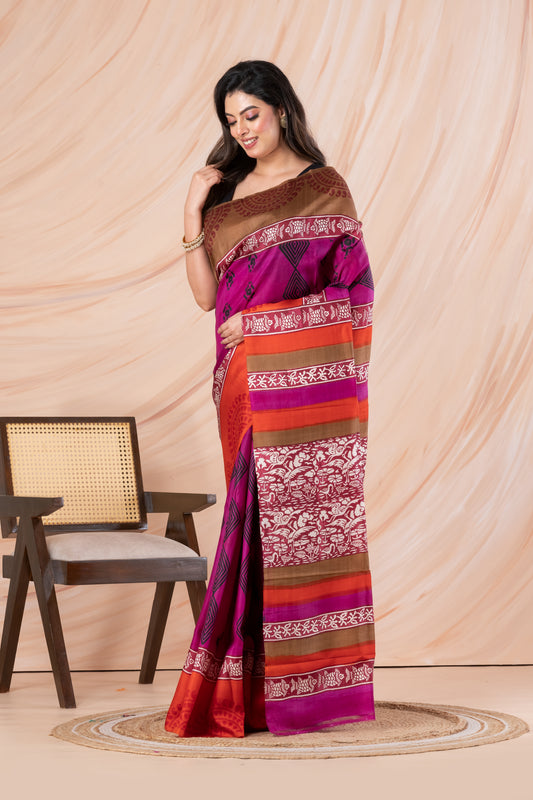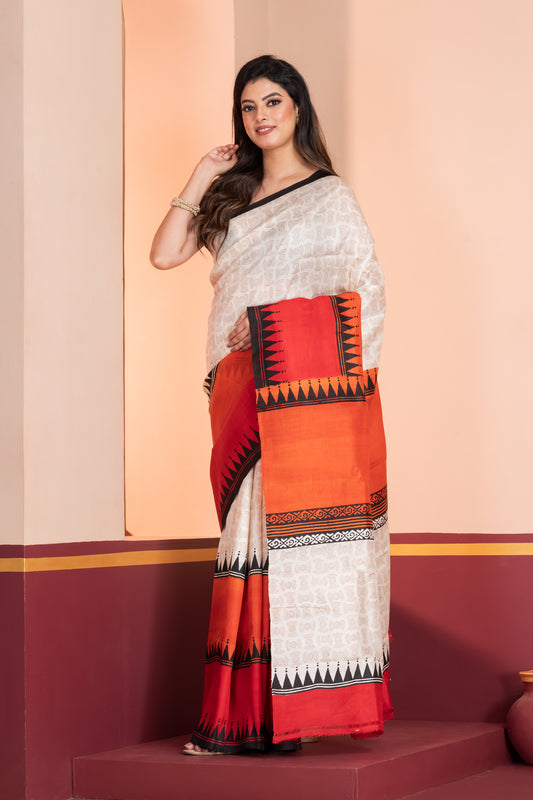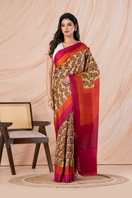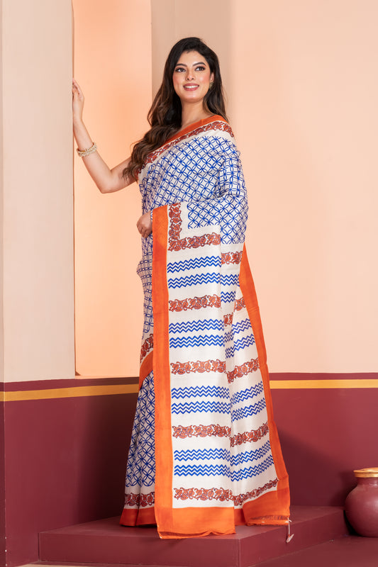 Pure printed silk with an orange border, paired with a plain orange blouse piece.