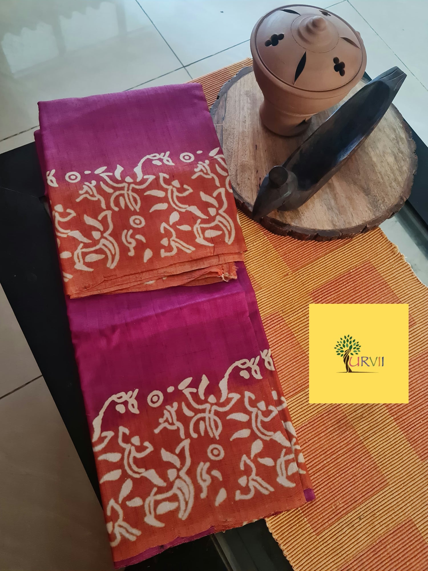 This earthy saree blends rust-orange and magenta tones with elegant white folk-art block prints. A unique, artistic piece perfect for casual ethnic wear or daytime gatherings.