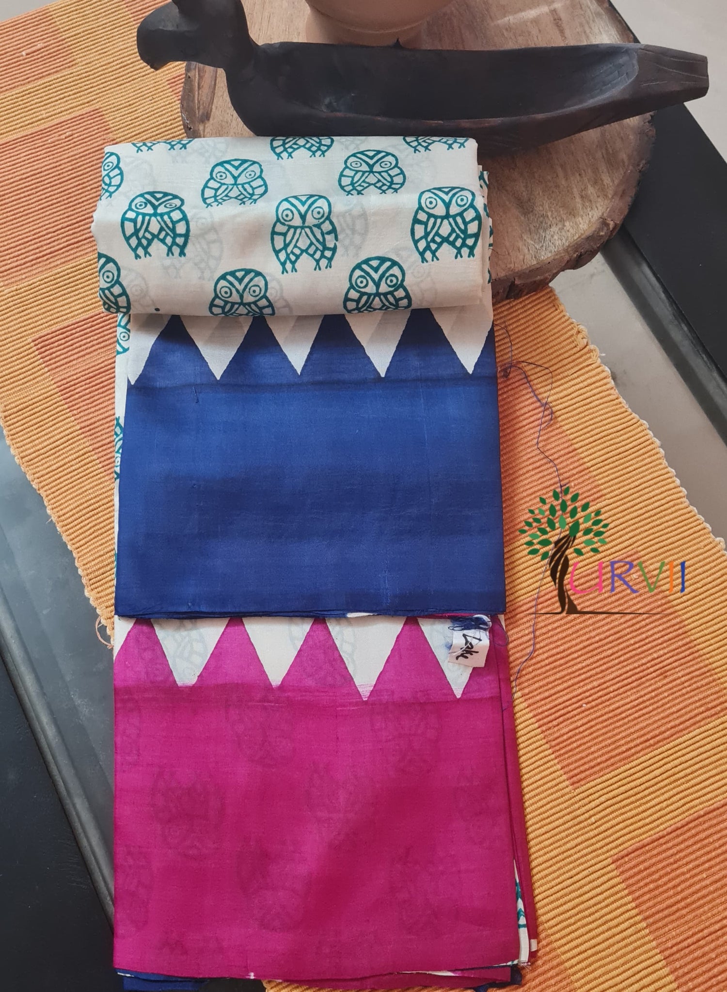 A fun, fusion design with teal owl block prints, deep indigo body, and magenta base accented by chevron triangles. Ideal for modern ethnic styling and relaxed cultural outings.