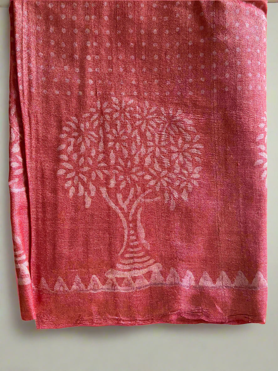 Minimal yet powerful, this rosewood red saree features a hand-blocked Tree of Life motif and subtle dotted textures. A serene, graceful option for spiritual events or elegant daytime wear.