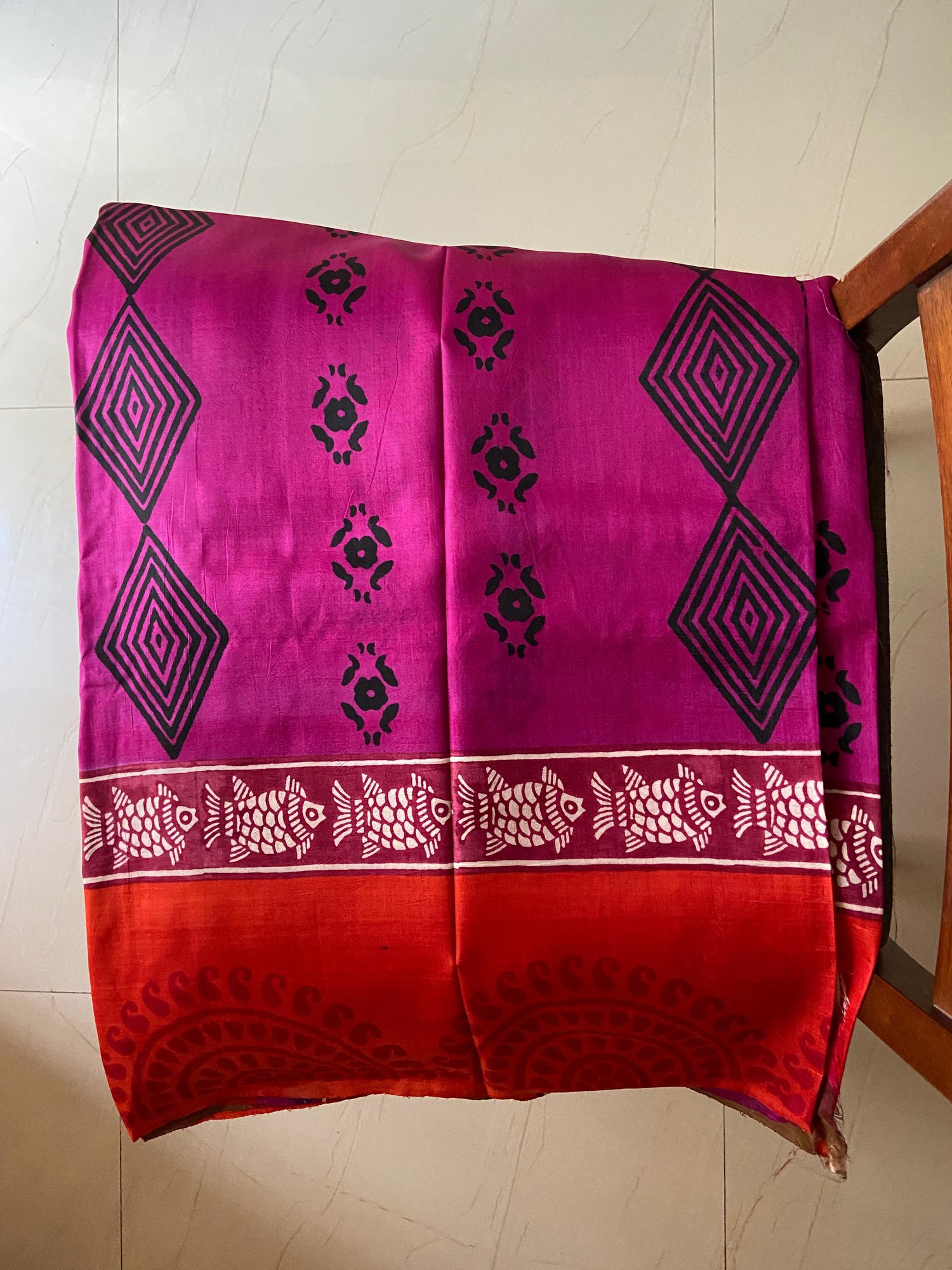 A bold magenta saree featuring hand-blocked tribal and diamond motifs, paired with a red pallu bordered in intricate fish designs. Vibrant and symbolic, it’s ideal for festive or cultural occasions.