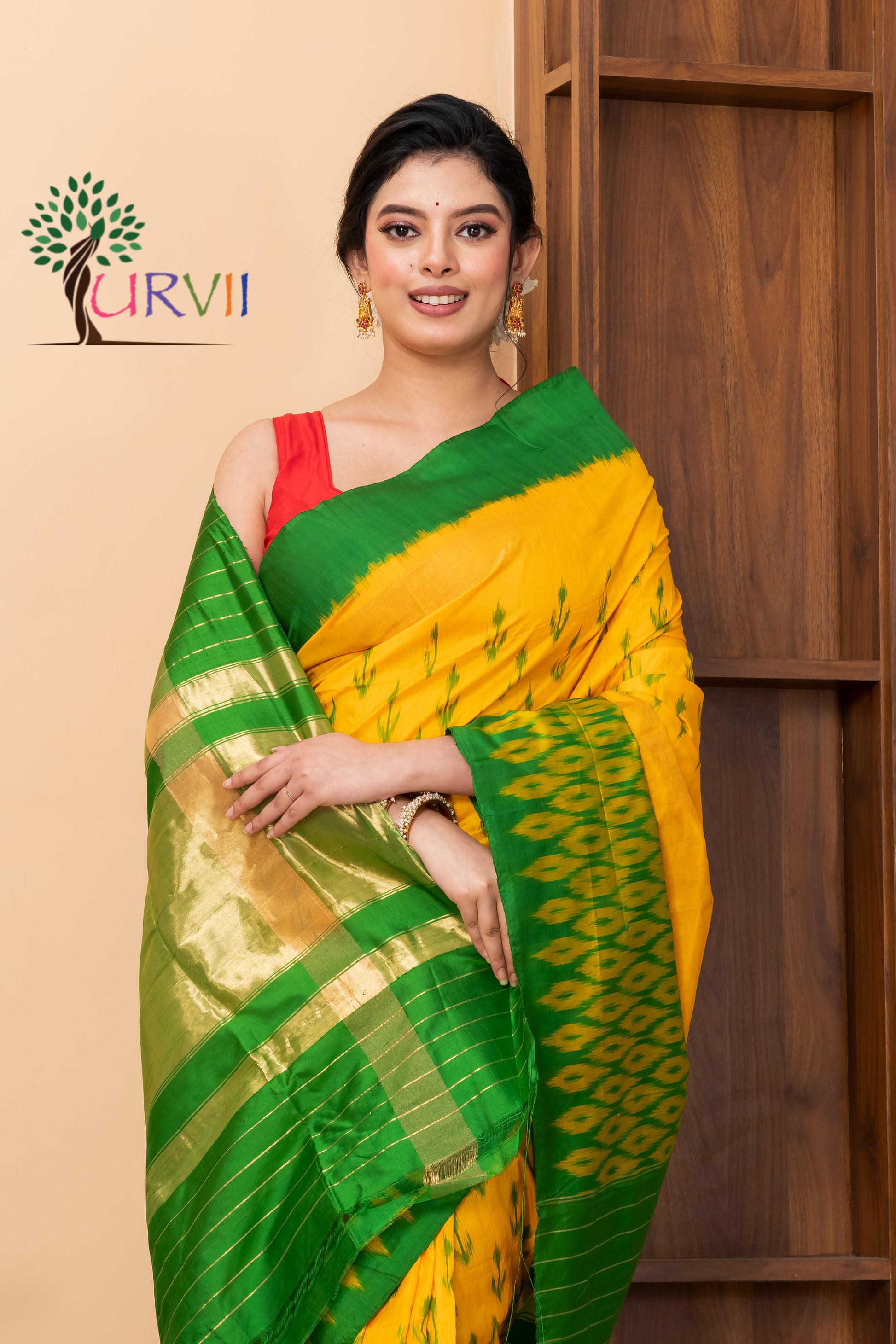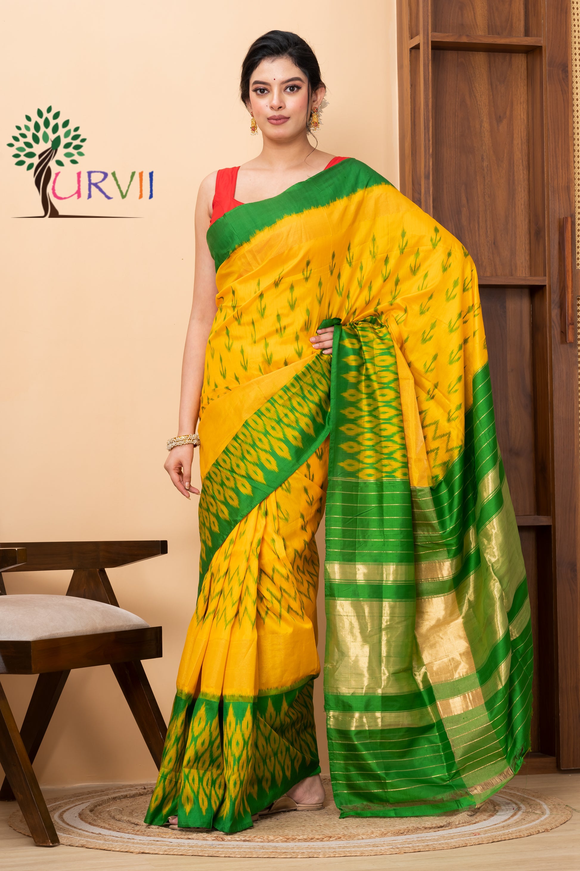Celebrate tradition with this Pochampally Double Ikat Silk Saree, crafted in pure silk and paired with a chic contrast blouse piece.