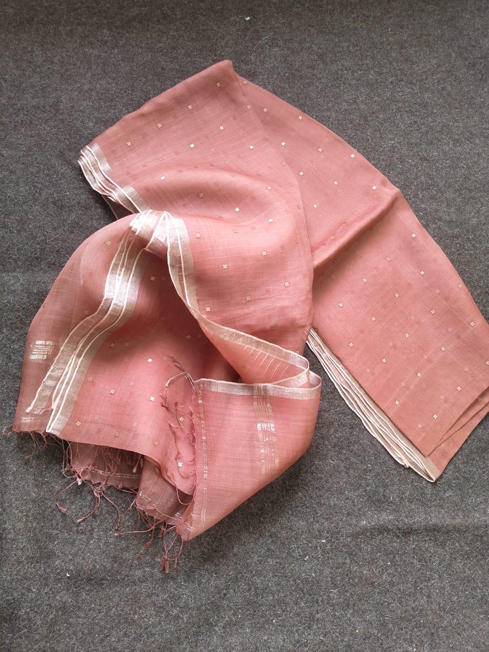 This saree is carefully handcrafted using pure 3 ply Resham silk in the warp and weft, with intricate sequin pocket weaving throughout. It is adorned with zari borders and stripes, adding to its elegance. Made with handspun Resham silk, this saree is of superior quality. The length of this saree is 6.5 meters.