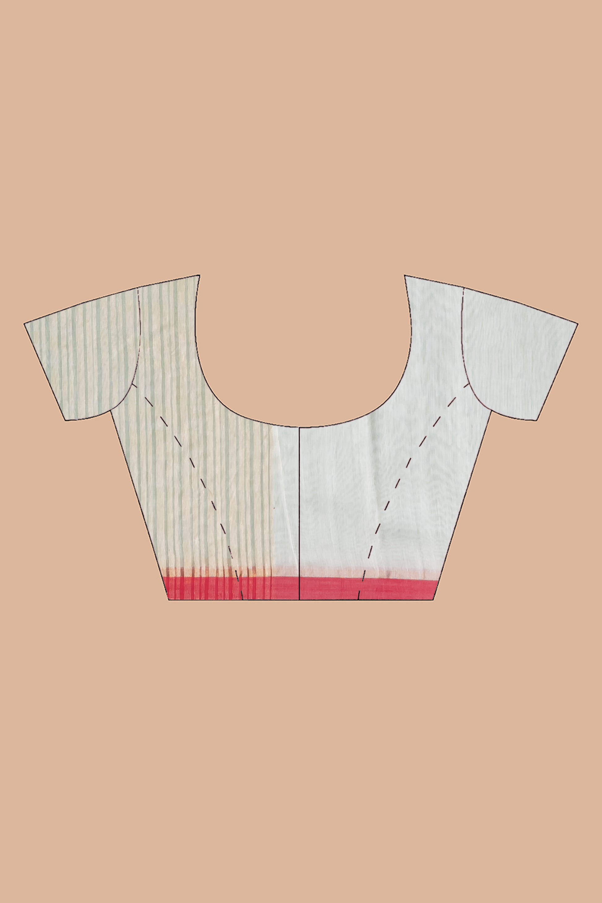 Handwoven Resham Gheecha Saree. With its subtle self-stripes and striking red paisley embroidery, this saree is a tribute to timeless craftsmanship. The thin red border and rich Gheecha pallu add just the right amount of definition to this ivory beauty.