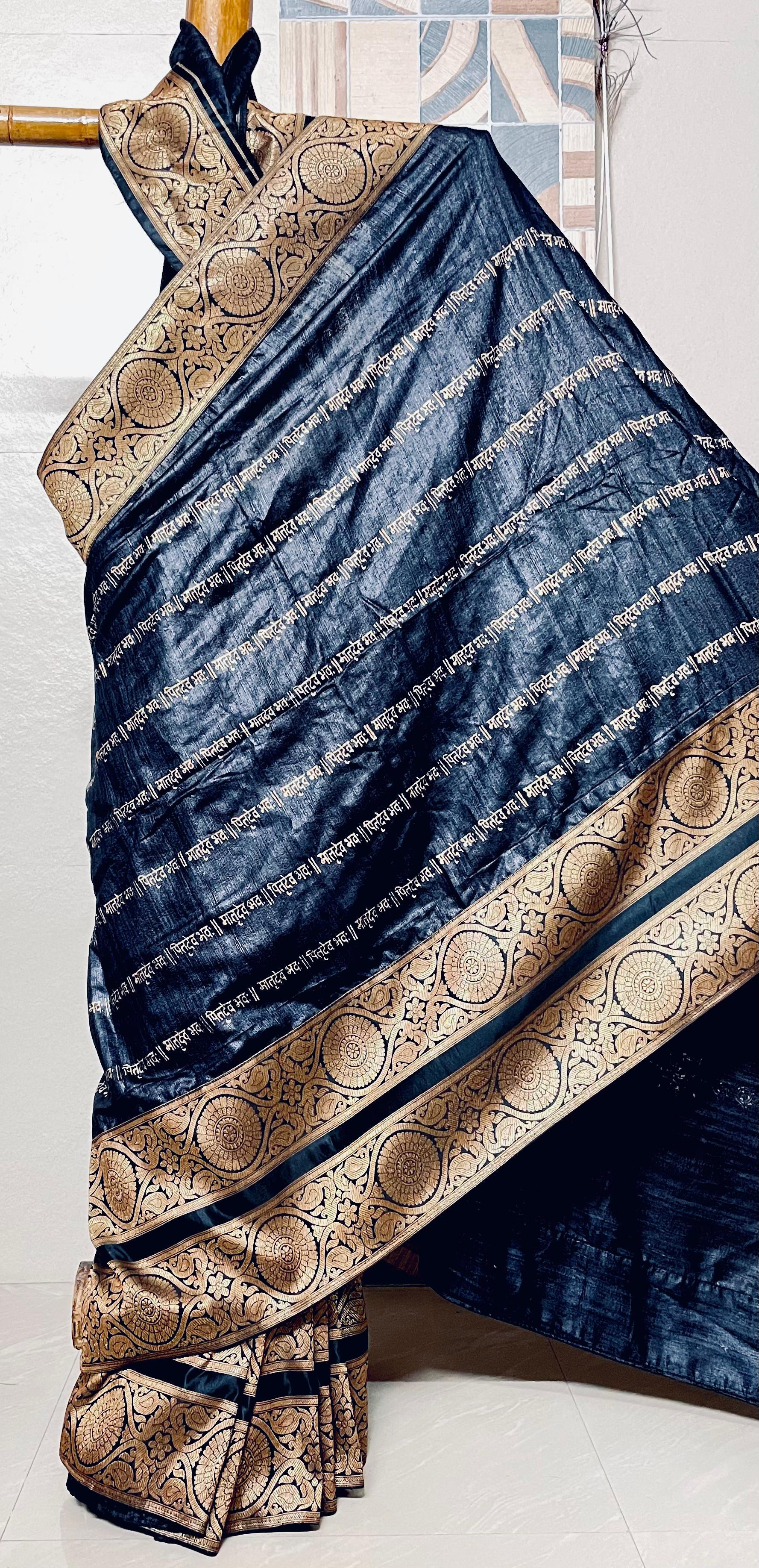 Wrap yourself in elegance with this Pure Black Ghicha Silk Saree, where artistry meets heritage. Crafted from certified Pure Ghicha Silk, it features a hand block printed pattern with 2.5 meters of intricate script and 3 meters of delicate floral designs. Enhanced by a striking Pure Benarasi Patch Border in black, it imparts a majestic touch. The saree is completed with a matching black Ghicha silk blouse piece for a polished, sophisticated look.