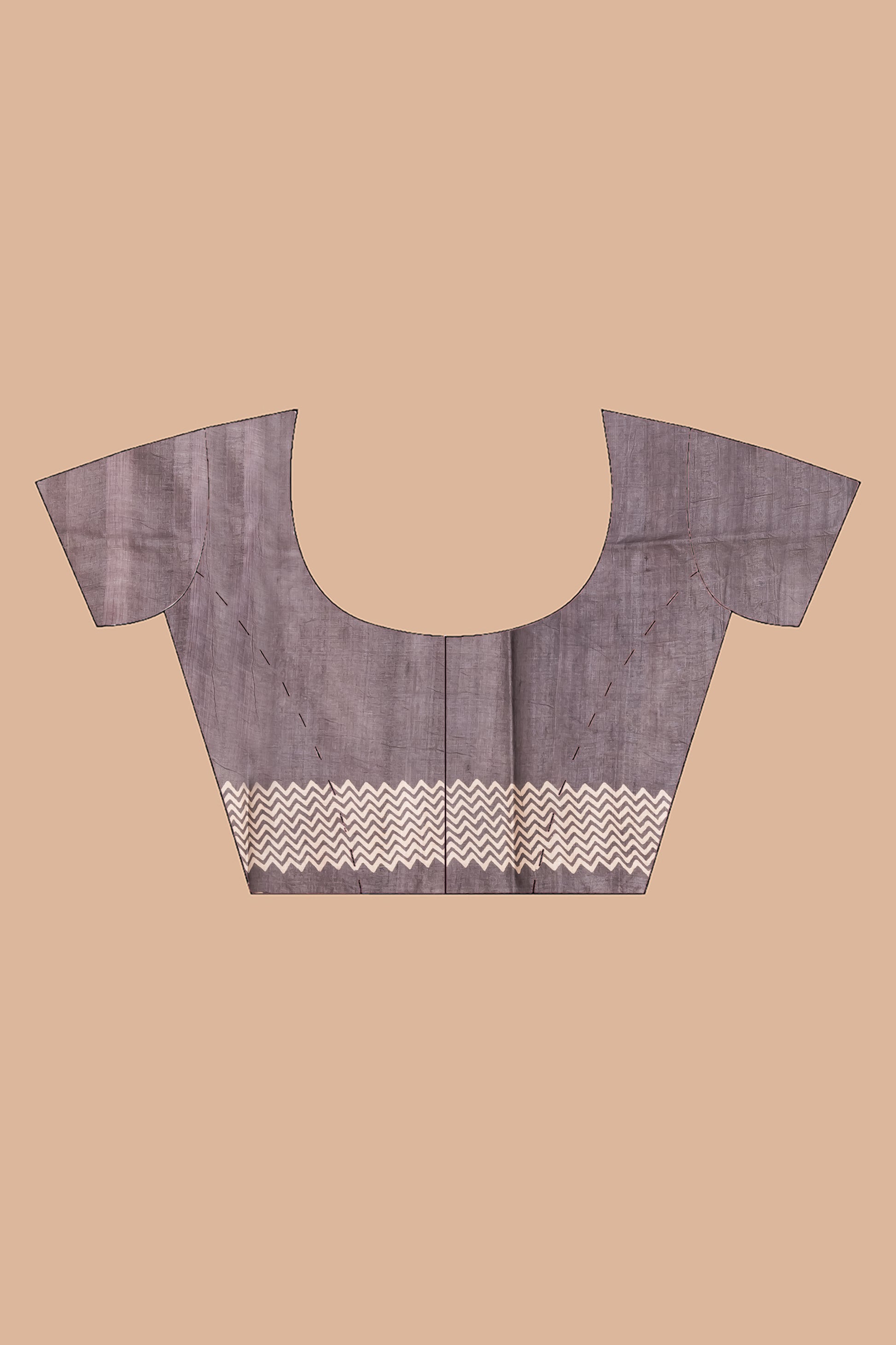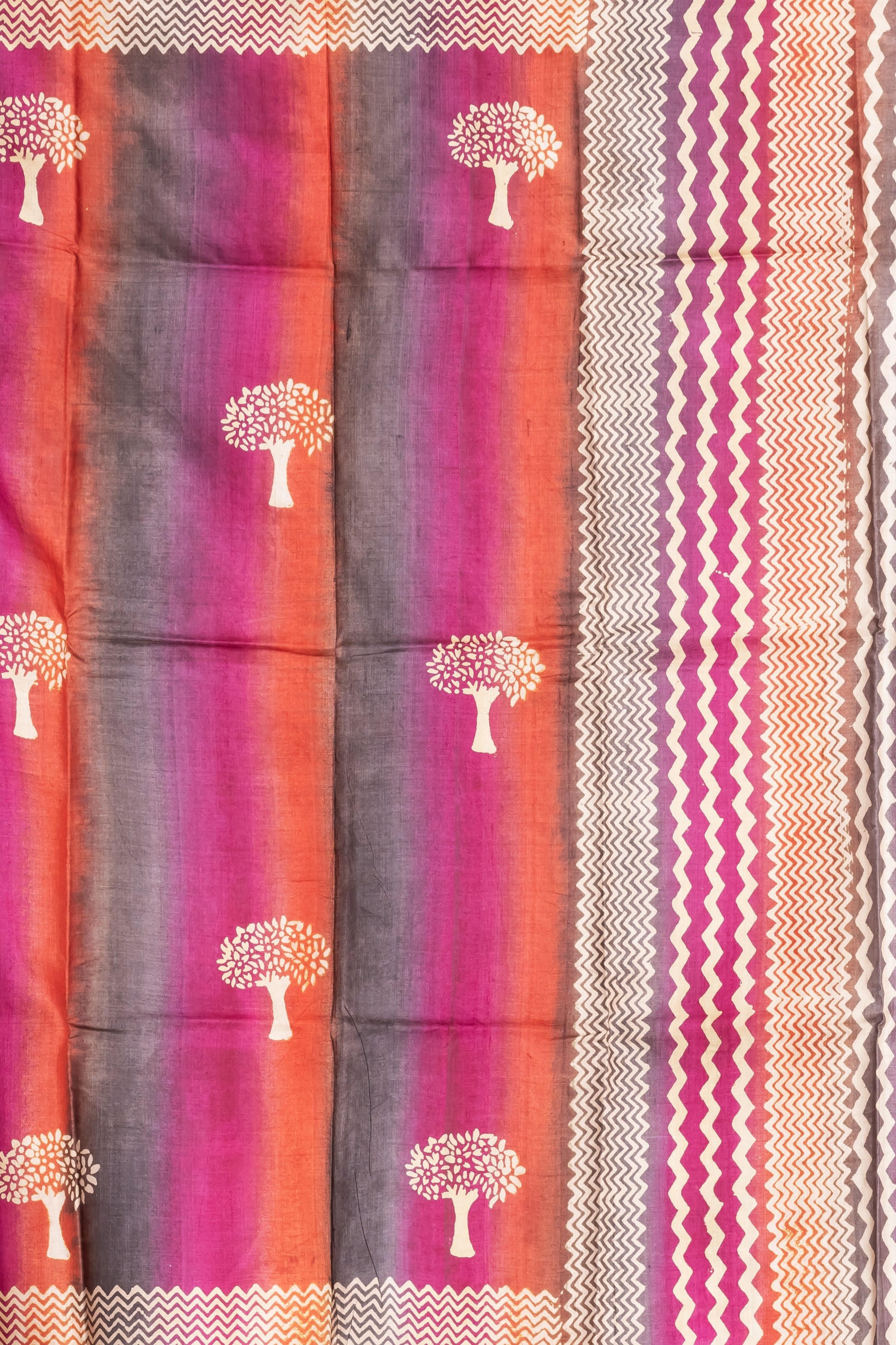 Woven in the raw elegance of pure tussar, this saree tells a story of harmony. One half carries the calm of soft grey prints, while the other comes alive in playful stripes of grey, orange, and pink, like dawn breaking into day. Scattered across its canvas are delicate tree motifs, a reminder of roots, growth, and timeless beauty. Finished with a plain grey blouse piece, it lets the saree’s artistry take center stage.